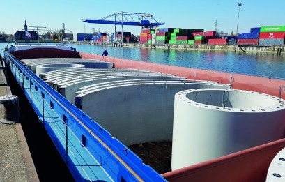 Ci-contre des segments de tours en béton à leur arrivée dans le port fluvial de Strasbourg