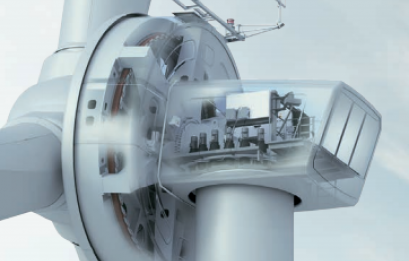 La nacelle abrite le cœur de l'éolienne, notamment la génératrice électrique permettant de transformer l’énergie cinétique créée par la rotation du rotor de l’éolienne en électricité et le système de freins.